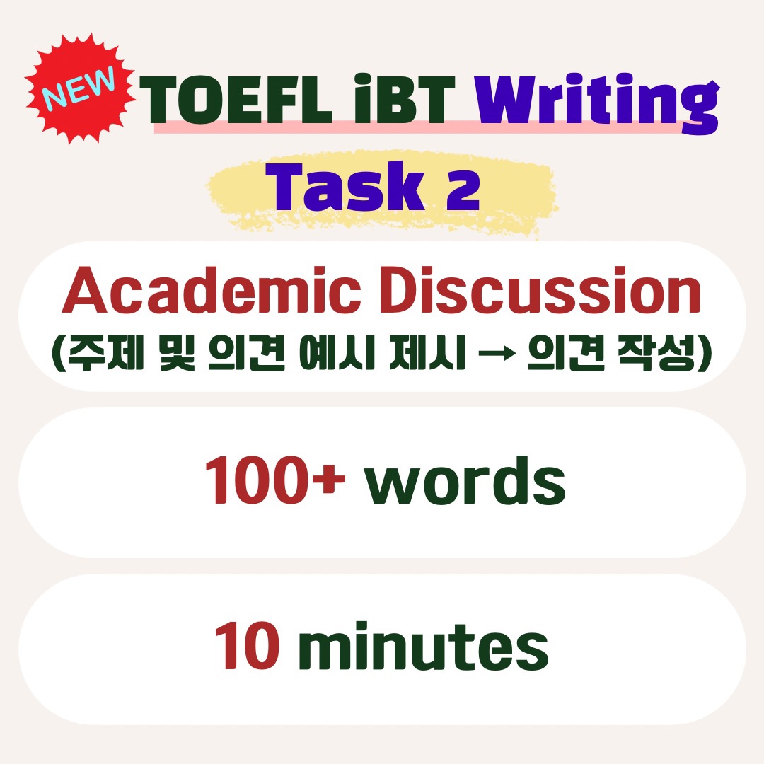 토플 라이팅에서 학술 토론형 문제는 대학에서 온라인 토론을 배경으로 한다. 교수님이 주제에 대한 질문을 온라인에 게시하고, 두 명의 다른 학생이 교수님이 제시한 주제에 대해 의견을 게재한다. 해당 글을 읽고, 수험자는 토론에 참여하여 본인의 의견을 작성해야 한다. 토론형 쓰기 문제는 10분이 주어진다. 응답의 최대 길이 제한은 없지만, ETS에서는 최소 100 단어 이상을 적으라고 설명한다. 수험자의 글에는 아래와 같은 사항을 포함해야 한다.