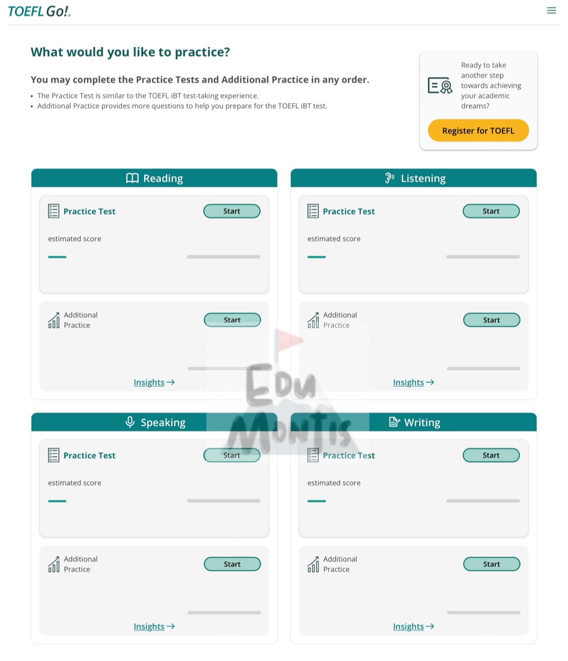 TOEFL Go는 TOEFL iBT 토플시험을 연습할 수 있는 페이지로 TOEFL Official 앱 또는 ETS 공식 웹사이트에서 회원가입을 하면 누구나 액세스 가능하다.