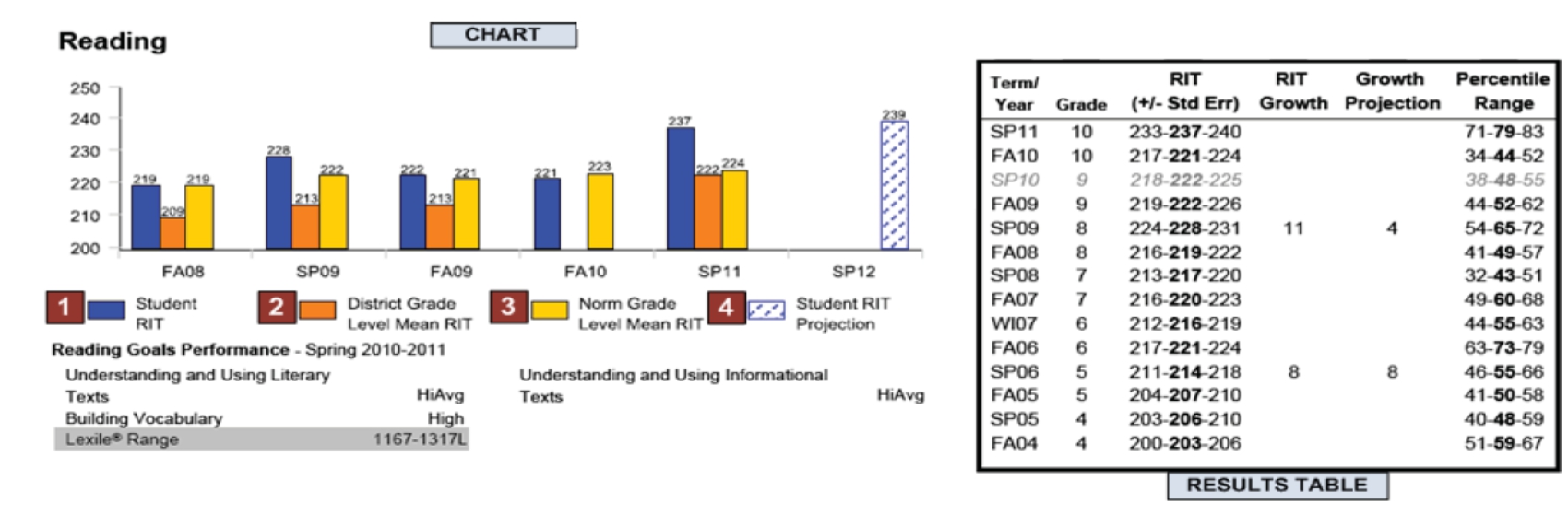 미국 커리큘럼을 기반으로 등급화된 성적을 알려주는 성취도 점수이다. RIT는 인치가 있는 눈금자와 같은 등간격으로 등급 간의 차이가 동일하다.